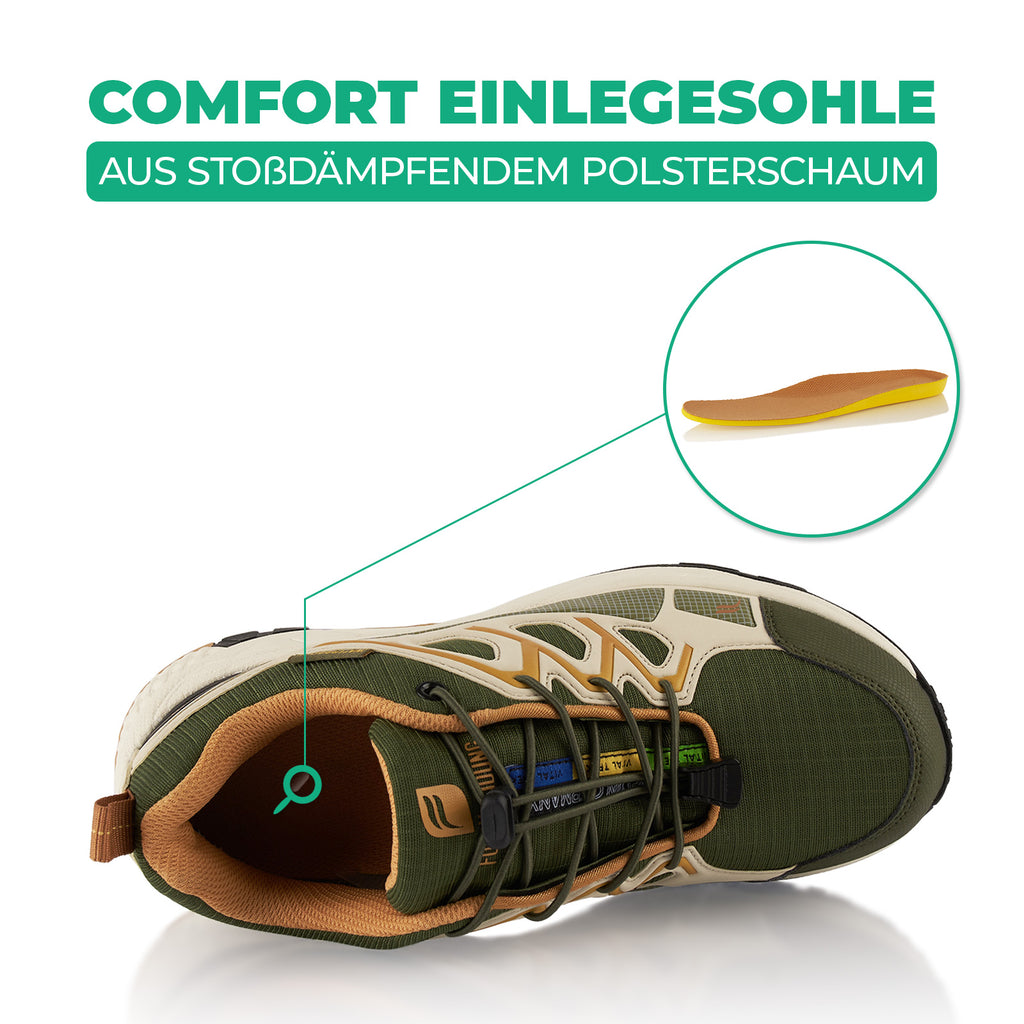 • Einlagen: Ergonomische Comfort Einlegesohlen aus stoßdämpfendem Polsterschaum, wechselbar für individuellen Komfort.