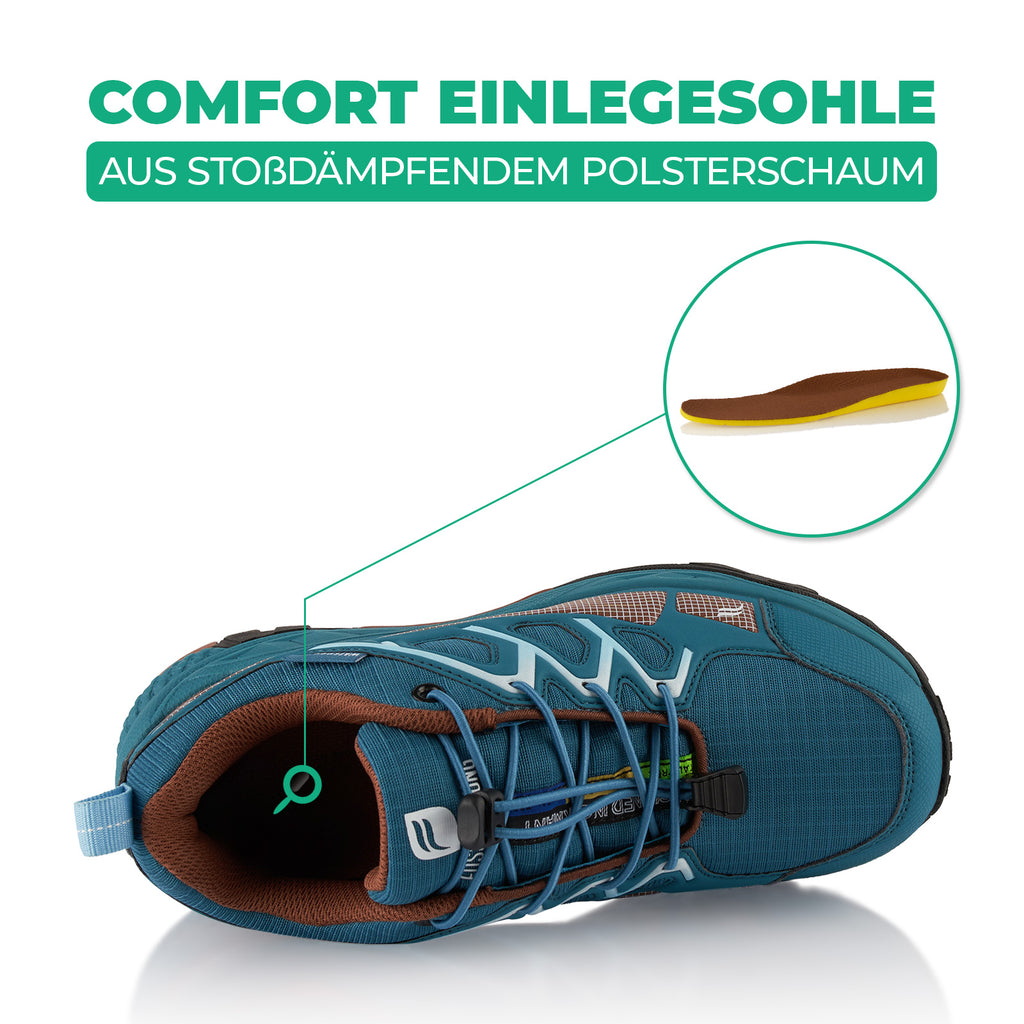 • Einlagen: Ergonomische Comfort Einlegesohlen aus stoßdämpfendem Polsterschaum, wechselbar für individuellen Komfort.