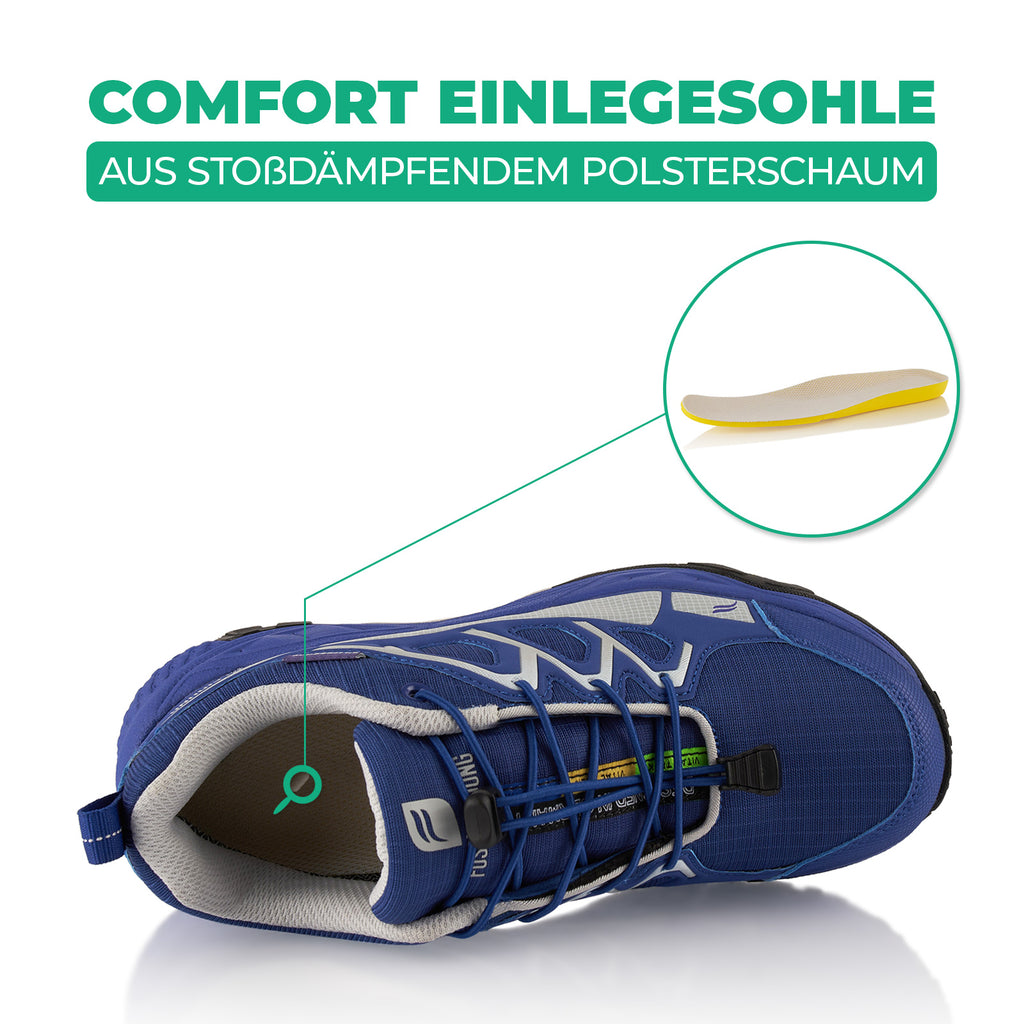 • Einlagen: Ergonomische Comfort Einlegesohlen aus stoßdämpfendem Polsterschaum, wechselbar für individuellen Komfort.