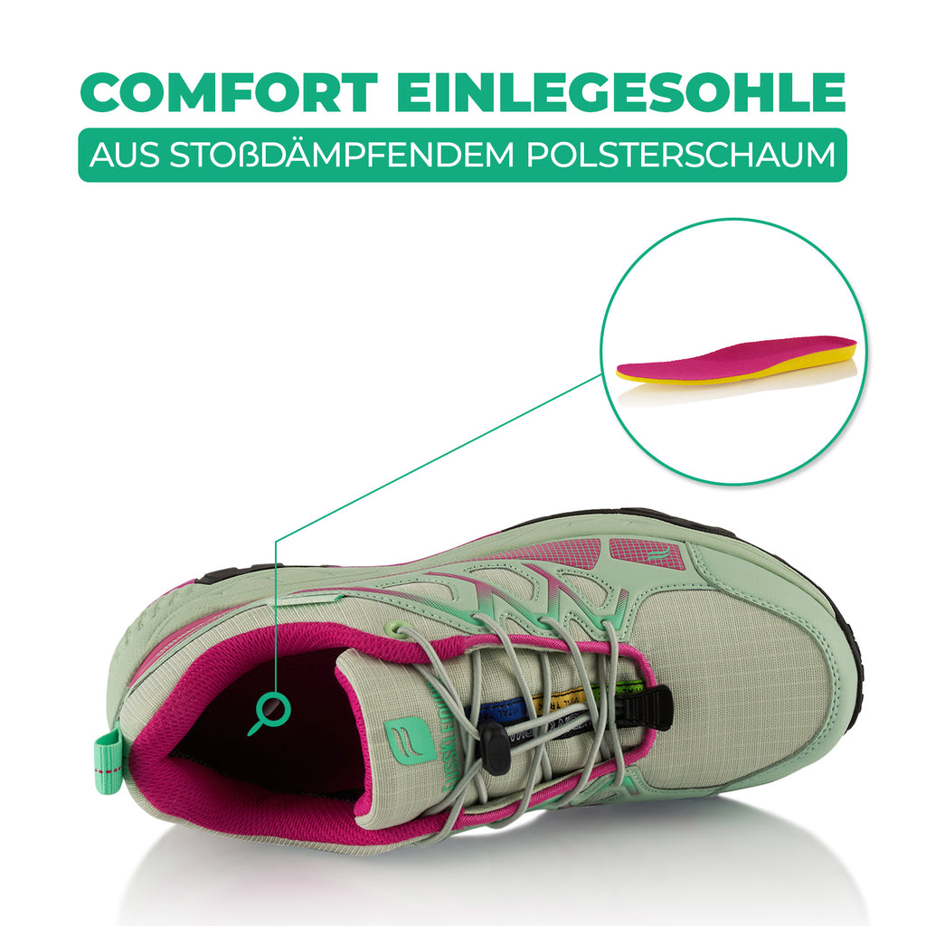 • Einlagen: Ergonomische Comfort Einlegesohlen aus stoßdämpfendem Polsterschaum, wechselbar für individuellen Komfort.