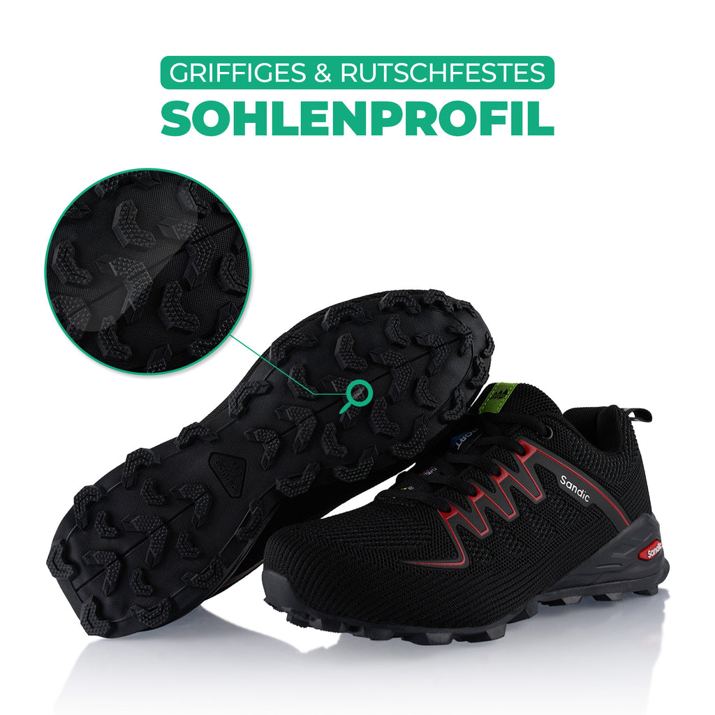 • Sohle: Perfekter Halt auf feuchten und unebenen Untergründen (Sohlenstruktur und -geometrie)