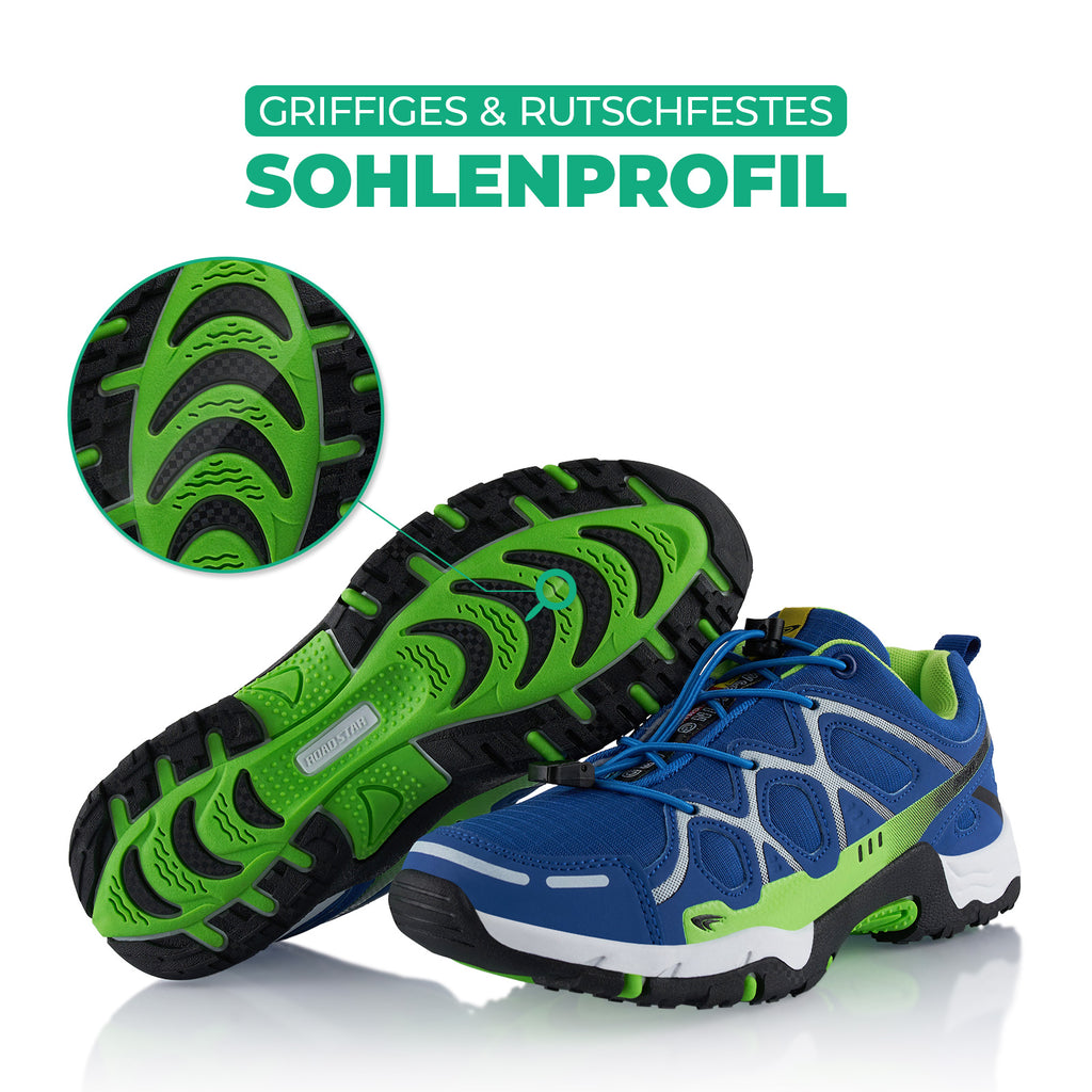 • Sohle: Perfekter Halt auf feuchten und unebenen Untergründen (Sohlenstruktur und -geometrie)