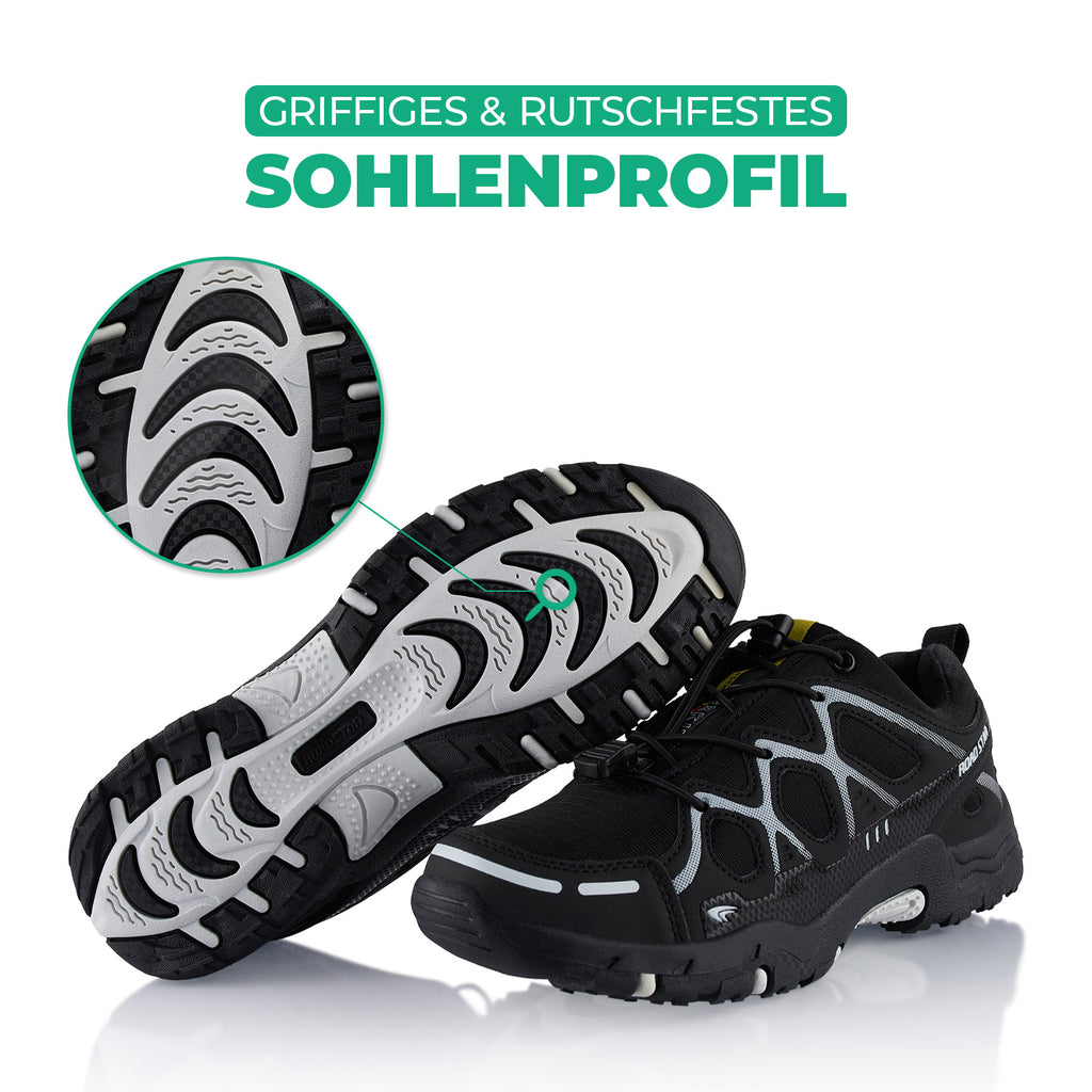 • Sohle: Perfekter Halt auf feuchten und unebenen Untergründen (Sohlenstruktur und -geometrie)