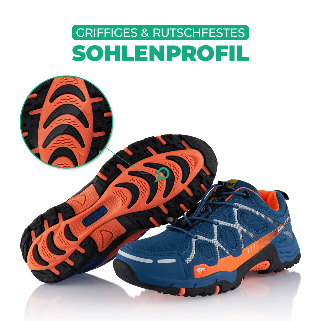 • Sohle: Perfekter Halt auf feuchten und unebenen Untergründen (Sohlenstruktur und -geometrie)
