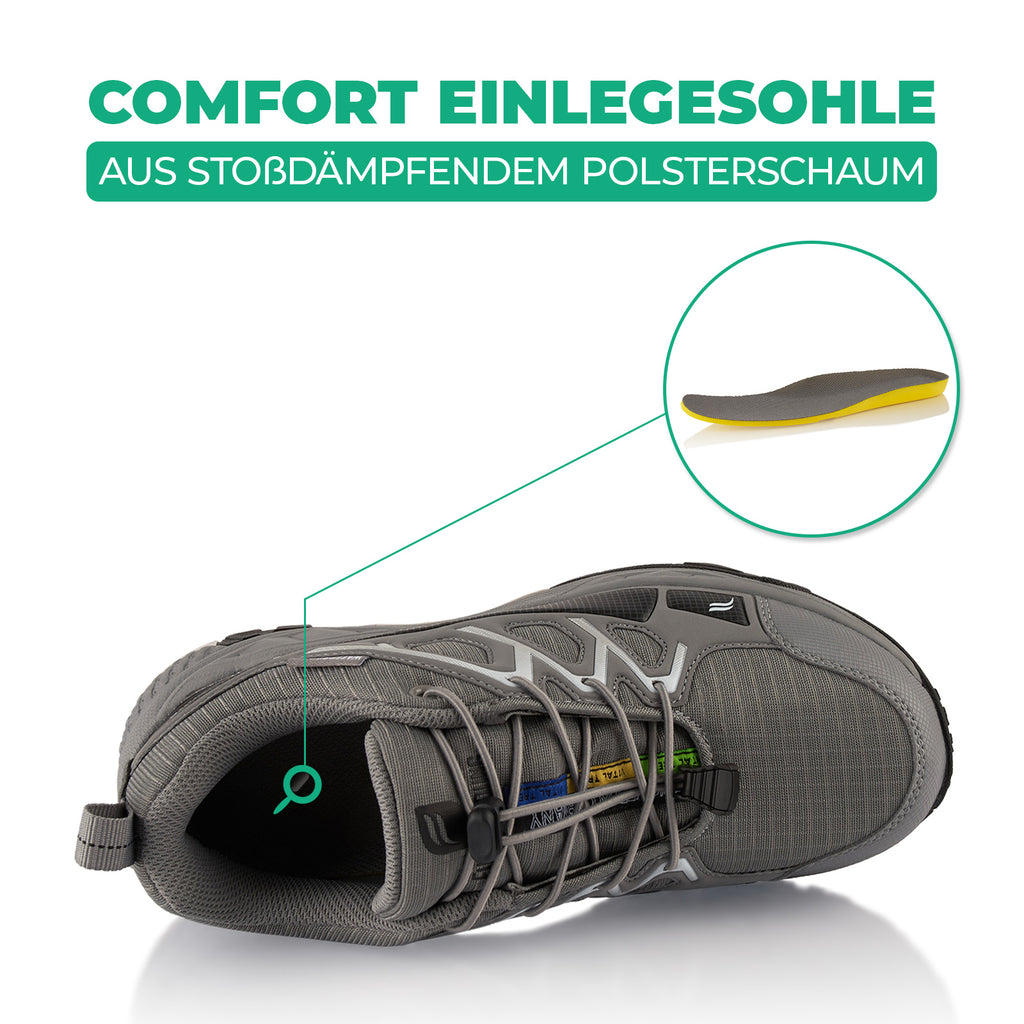 • Einlagen: Ergonomische Comfort Einlegesohlen aus stoßdämpfendem Polsterschaum, wechselbar für individuellen Komfort.