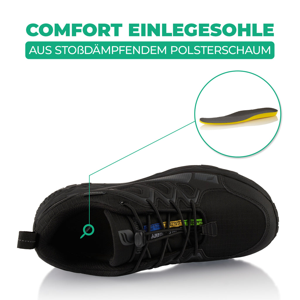 • Einlagen: Ergonomische Comfort Einlegesohlen aus stoßdämpfendem Polsterschaum, wechselbar für individuellen Komfort.